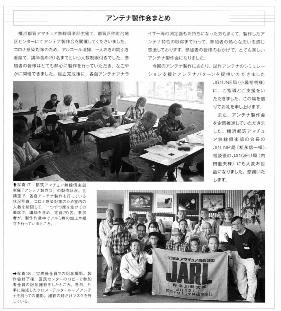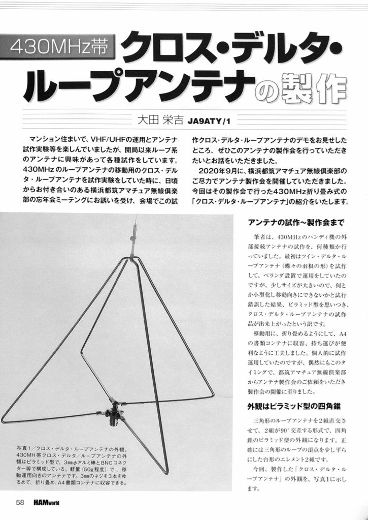 アンテナ製作会「430MHz帯 クロス・デルタループアンテナ」 7/19発売のHAM world 9月号にJA9ATY大田さんの「430MHz帯 クロス・デルタループアンテナの製作」 記事が10ページにわたり掲載されました。これは2020年9月に都筑アマチュア無線倶楽部主催で行ったアンテナ製作会の時の製作記事や製作データが網羅されています。この号内でも最多のページをさいて紹介されています。製作様子や最後の集合写真も載っています。是非購入してご覧ください。 「HAM world 」 特集 アウトドアで思い切り無線を楽しもう! 出版社:㈱電波社 発行日:2021年7月19日 定価:1,000円(税込)